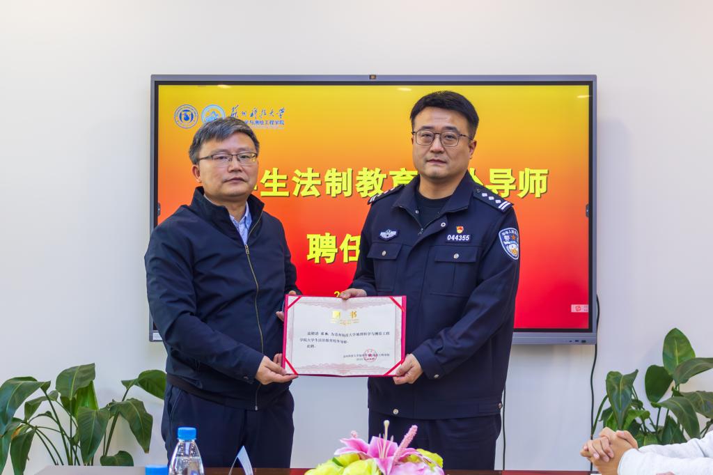 建设法治校园的坚定决心,同时对同学们提出了知法、懂法、守法、用法的殷切期望。彭科为陈凯警官颁发大学生法治教育校外导师聘书。